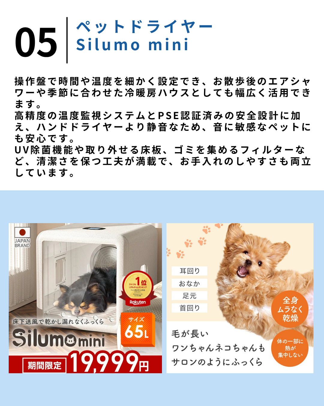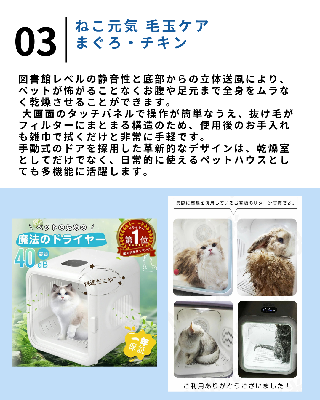 2026.4.13 【保存版】楽天で買えるおすすめ猫グッズ5選【#PR】 ★10,000円OFF!★427冠1位達成!ペットドライヤー ペット ドライルーム 猫 ドライヤー ペット ボックス ペット 乾燥 犬 ペットドライヤー ドライルーム ドライヤーハウス 犬 ドライヤー ボックス ペット乾燥機 静音 小型犬 テディ専用 温度調節 多頭飼 風量調整価格:18,860円~(税込、送料無料) (2026/4/13時点) 楽天で購入 【母の日ギフト】ドライヤーハウス ドライボ・プラス ホームランペット homerunPET Drybo Plus ペットドライヤー 犬 猫 ドライルーム ペット乾燥機 ブロワー 静か 速乾 ペットにも使える ドライハウス 日本規格 PSE価格:51,810円(税込、送料無料) (2026/4/13時点) 楽天で購入 楽天1位★【限定1500円OFFクーポン】★ ペット用ドライヤー 1台4役 62L 82L 見守り天窓タイプあり ペットドライルーム ペットドライヤー PSE認証済 抜け毛 脱臭機 ペット 犬 猫 急速乾燥ケース 静音 ドライヤーボックス 温度調整 ドライヤールーム 自動 乾燥機価格:17,920円~(税込、送料別) (2026/4/13時点) 楽天で購入 ★クーポン後25186円~★ペット ドライヤー ボックス【72L大容量・見守り天窓付き】Petaboo ペット乾燥機 ペットドライヤールーム ペットドライヤードア着脱式 1台4役 猫 犬 ドライヤー シャワールーム 猫用ドライヤー ペットバス 風速 温度調整 mh66t価格:35,980円(税込、送料無料) (2026/4/13時点) 楽天で購入 ★最安挑戦中★【楽天1位】ペットドライヤー Silumo mini シルモミニ ペットドライヤーハウス ドライルーム 65L 70L 速乾 猫 犬ドライヤーボックス ペットドライルーム ドライボックス ドライハウス 大容量 静音 清潔 ペットドライヤーボックス価格:19,999円(税込、送料無料) (2026/4/13時点) 楽天で購入