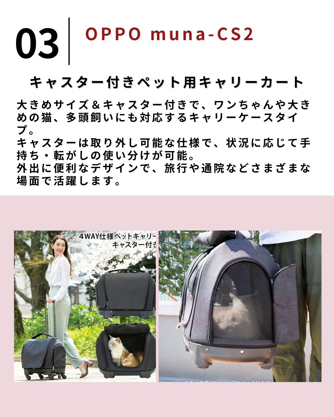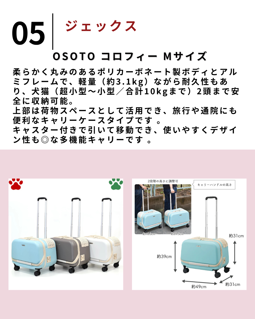 2025.7.17 【保存版】キャスターペットキャリー5選【#PR】 ペットバック 2層 2匹 ペットキャリーバック 2層 2匹 猫 多頭飼い 猫 キャリーバッグ 2匹用 多頭 ペット お出かけ 犬 猫 4輪 2匹 猫 キャリー 2匹 安定性 ペットキャリー 2匹 通気性 猫2匹用キャリーバック おしゃれ 犬 キャリーバッグ キャリー付きペット 散歩、旅行、入院価格:4,999円~(税込、送料無料) (2025/7/17時点) 楽天で購入 【特典付】 ペットカート 小型犬 多頭対応 犬カート 対面式正規品 エアバギー ドーム3 レギュラー ディムグレー AIRBUGGY DOME3 PREMIER REGULAR SET [DIM GREY] ADLI0161ペットバギー ドッグカート◇折りたたみ 3輪 ブレーキ付き 犬 猫 バギー 送料無料 P5倍価格:81,400円(税込、送料別) (2025/7/17時点) 楽天で購入 OPPO muna-CS2 オッポ ペットキャリア ミュナCS2 (06850) キャスター付きペット用キャリーカート価格:53,900円(税込、送料無料) (2025/7/17時点) 楽天で購入 ペットキャリー ペチコ 3001-M PETico 1年保証 犬 ネコ 小型犬 中型犬 ペットカート ペットバギー キャリーケース キャリーバッグ スーツケース ペティコ ico イコ かわいい 旅行 通院 帰省[PO10][防災 防災グッズ]価格:32,780円(税込、送料無料) (2025/7/17時点) 楽天で購入 【0】 GEX OSOTO コロフィー M ミルク / モカ / アクア10kg以下 犬用 猫用 キャスター付き 軽量 キャリーケース キャリーバッグ オシャレ かわいい お出かけ ホワイト 白 ブラウン 茶色 ブルー ミント 水色 OSOTOキャリー corofeel ジェックス価格:19,680円(税込、送料別) (2025/7/17時点) 楽天で購入